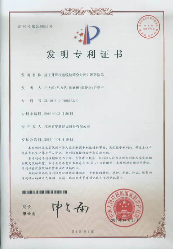 我公司又獲得一項國家發明專利授權 時間:2017-06-02 3948 日前,公司又一項發明專利獲得國家知識產權局授權,此項專利名稱為“施工升降機電纜儲筒全封閉自鎖防盜器”,專利號為ZL 2016 1 0106133.6。 至此,公司已有22項發明專利入賬。