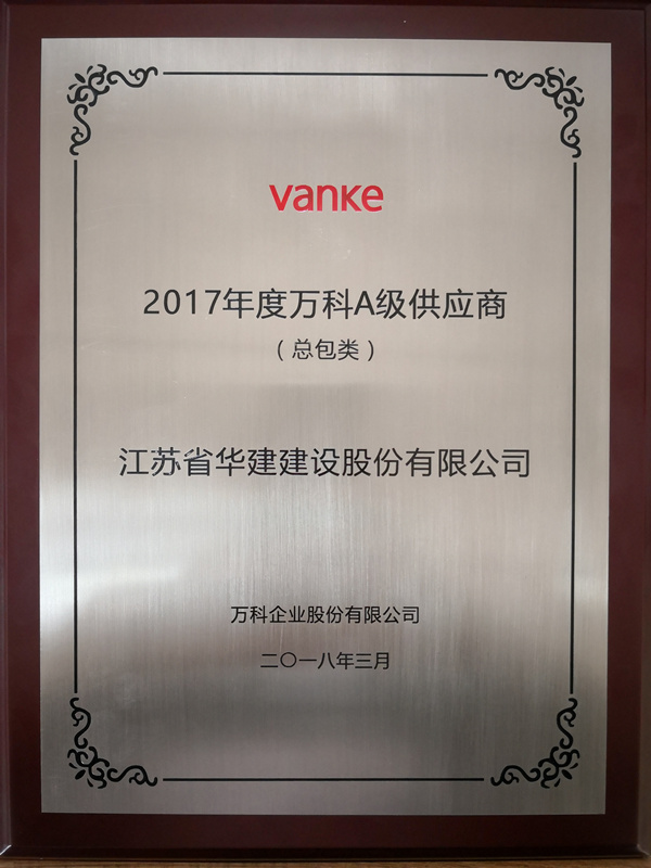 公司被萬科集團評為總包類2017年度萬科A級供應商