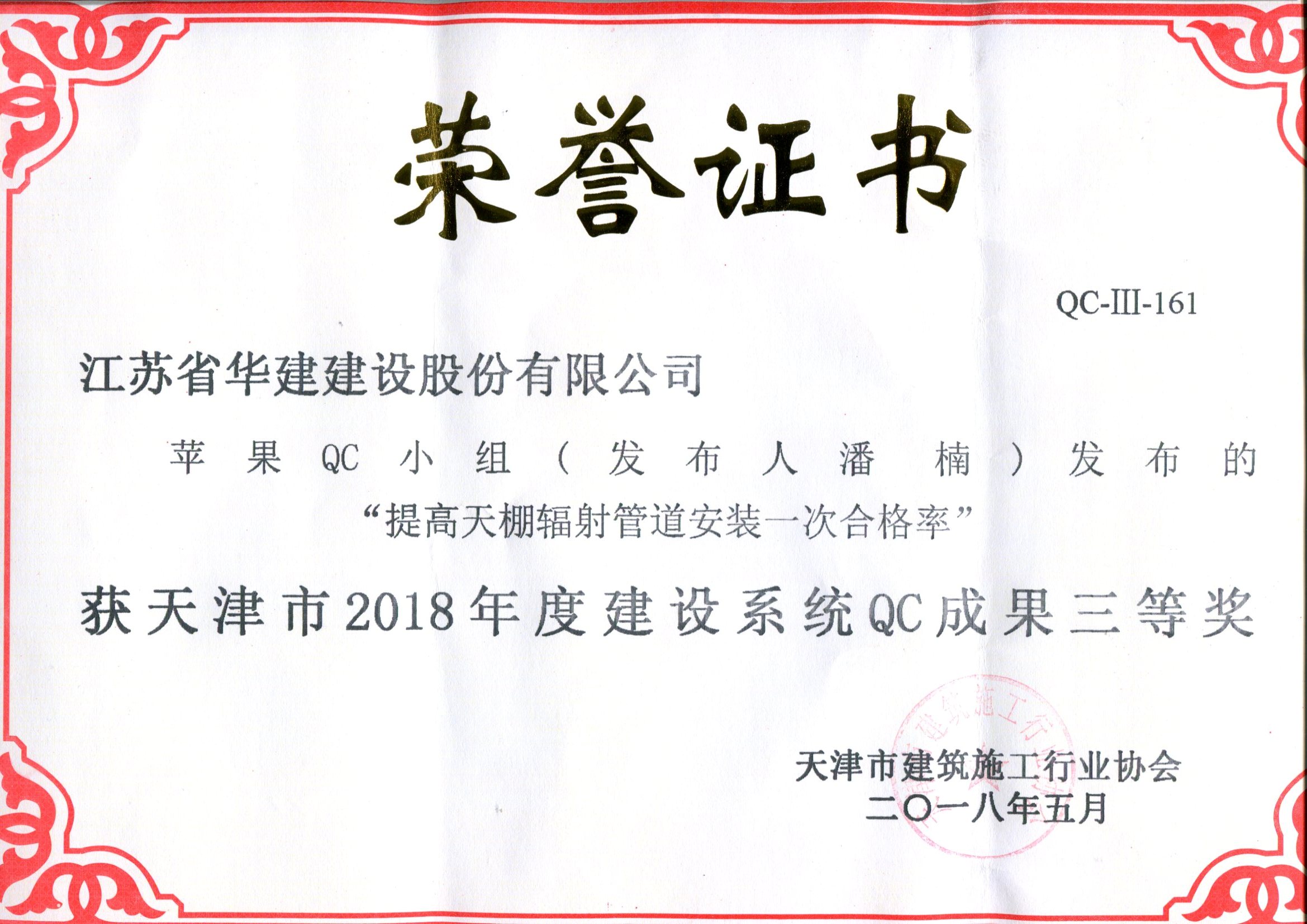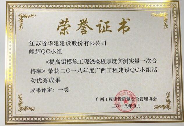 日前,北京公司有2項成果獲得省級表彰。蘋果QC小組“提高天棚輻射管道安裝一次合格率”榮獲天津市2018年度建設系統QC成果三等獎,峰輝QC小組“提高鋁模施工現澆樓板厚度實測實量一次合格率”榮獲2018年度廣西工程建設QC小組活動優秀成果一類成果。