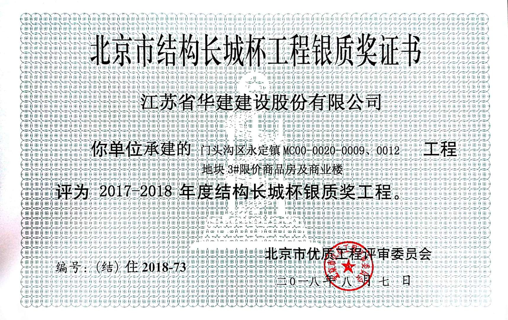 近日,北京市工程建設(shè)質(zhì)量管理協(xié)會(huì)公布了2017-2018年度北京市結(jié)構(gòu)長(zhǎng)城杯工程及獲獎(jiǎng)單位,由北京公司承建的門(mén)頭溝區(qū)永定鎮(zhèn)MC00-0020-0009、0012地塊3#限價(jià)商品房及商業(yè)樓項(xiàng)目獲得結(jié)構(gòu)長(zhǎng)城杯銀質(zhì)獎(jiǎng)。