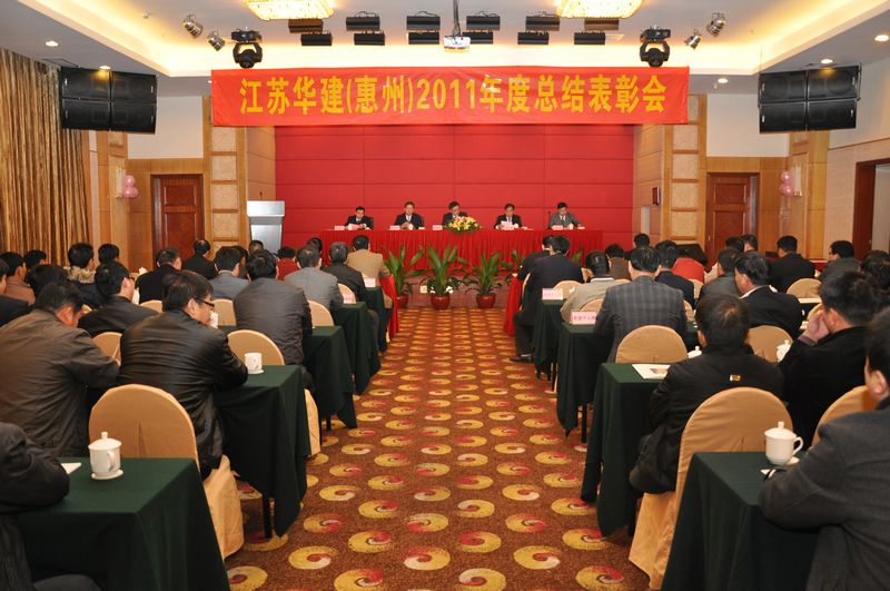 110,惠州金鑾酒店四樓會議廳,洋溢著一派歡樂祥和的氣氛。江蘇華建(惠州)2011年度總結表彰大會在這里隆重召開。公司副董事長、總經理宗有農、公司總經濟師蔡華國和惠州公司經營層等領導出席大會。
