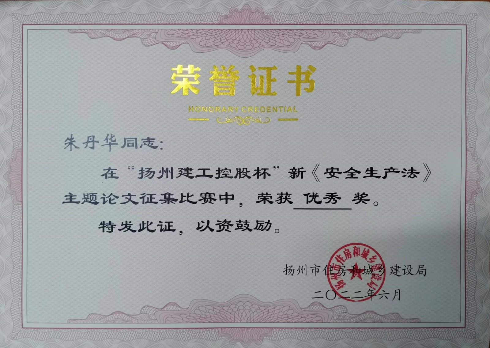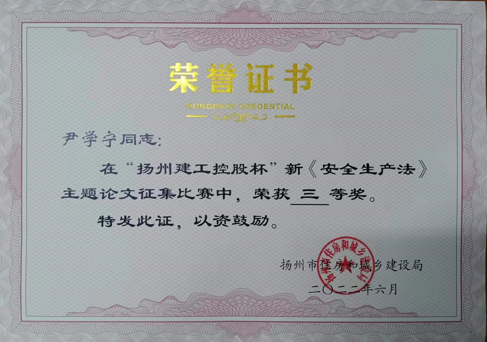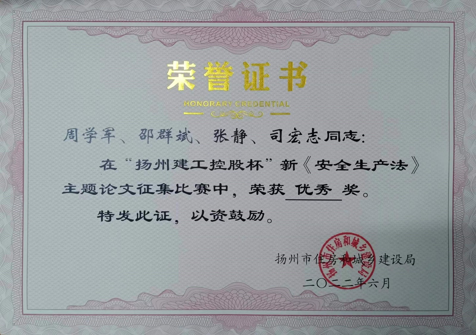 北京分公司4篇論文獲揚州市新《安全生產法》主題論文征文比賽獎項 時間:2022-07-16 3797 近日,從揚州市住房和城鄉建設局傳來喜訊,由北京公司投稿的4篇論文榮獲“揚州建工控股杯”新《安全生產法》主題論文征文比賽獎項,并獲頒證書,其中一等獎一項,三等獎一項,優秀論文獎兩項。