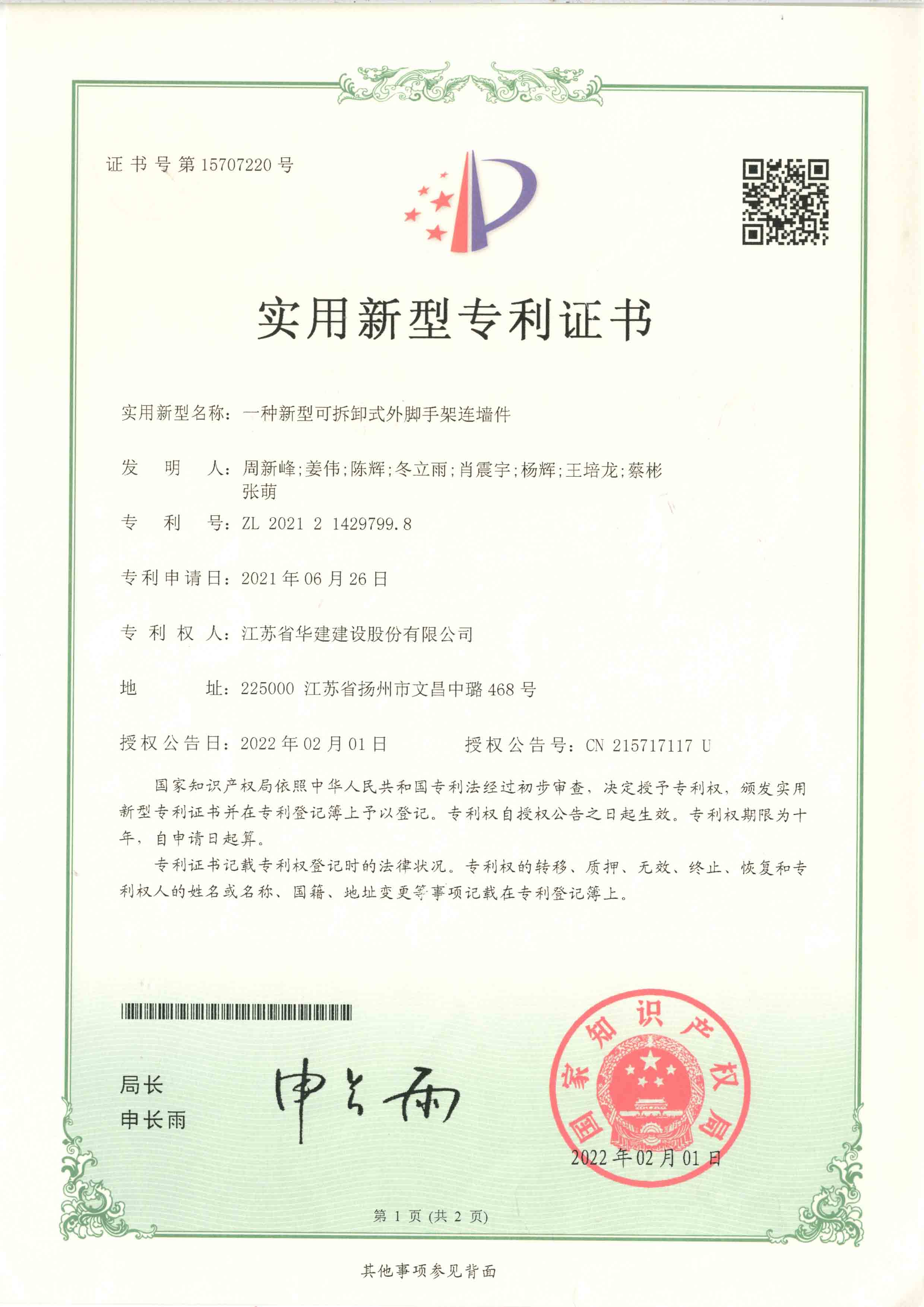 北京分公司2022年度已取得兩項實用新型專利證書 時間:2022-08-22 3659 日前,國家知識產權局頒發了實用新型專利證書,公司兩項專利取得實用新型專利證書,分別是:一種新型可拆卸式外腳手架連墻件、一種鋼筋混凝土現澆板板厚高精度控制裝置。