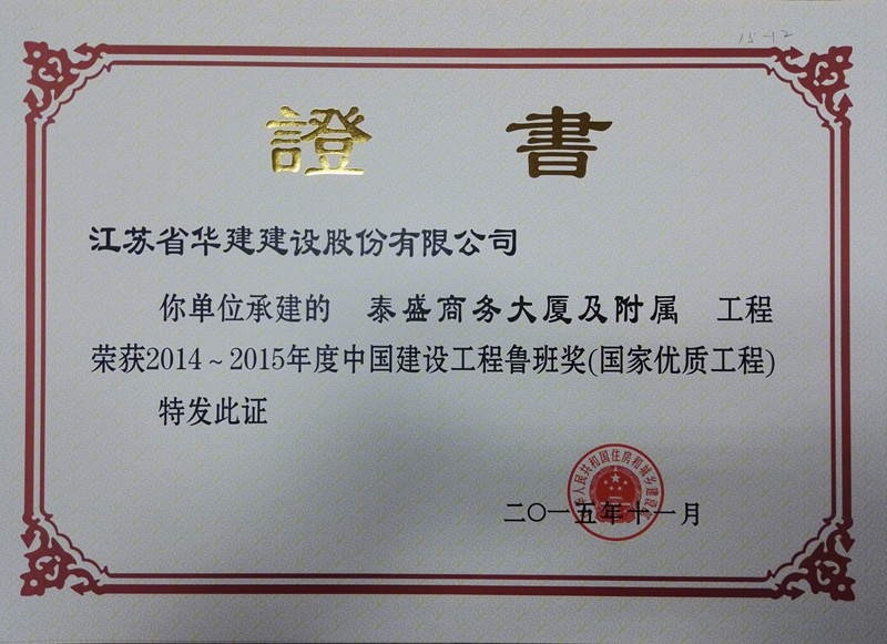 秦皇島泰盛商務大廈 時間:2015-11-23 17452 泰盛商務大廈及附屬工程地處秦皇島市經濟開發區核心位置,集商務辦公、會議中心、一站式服務大廳及報告演藝廳等功能為一體的綜合類商務辦公樓,地下1層,地上23層,裙樓兩層,建筑面積90148㎡,建筑高度97.75米。工程先后榮獲全國建筑業綠色施工示范工程、江蘇省新技術應用示范工程、江蘇省省級工法、河北省結構優質工程獎、河北省建設工程安濟杯獎(省優)、全國優秀項目管理成果獎、全國優秀QC小組成果一等獎。2015年,被中建協評為2014-2015年度中國建設工程魯班獎(國家優質工程)。