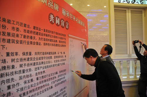 建安商會常務副會長吳士茂代表商會理事會作工作報告,秘書長戴壯民介紹了華建聯盟成立一年來的運行情況,主席臺上的各位領導為10個新進會員代表頒發證書。副會長曹德榮宣讀了市建安商會《打造“揚州建筑”品牌,服務世界名城建設共同宣言》,然后所有會長單位負責人一起上臺簽署《共同宣言》,表達了共同打造揚州建筑品牌、抱團包容發展、擔當建設秀美揚州生力軍的共同愿望。