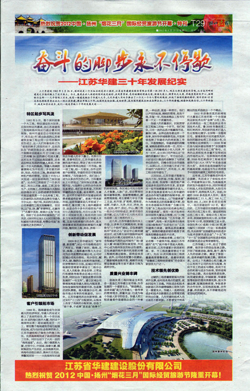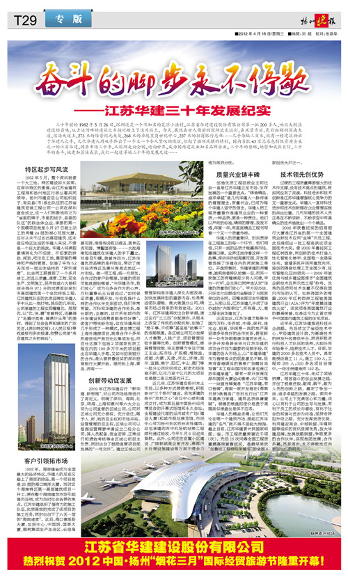 《揚州晚報》專版刊發公司三十周年宣傳文章 時間:2012-04-19 5683 4月18日,《揚州晚報》T29版刊發專版文章《奮斗的腳步永不停歇——江蘇華建三十年發展紀實》,從公司起步、市場開拓、創新發展、質量與科技等各個層面,介紹了公司三十年的奮斗歷程、綜合實力和發展業績。