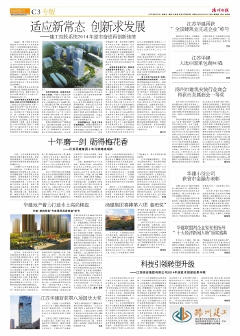 13日《揚州日報》刊發“揚州建工”專版 時間:2015-02-15 3439 2月13日《揚州日報》C3整版刊發“揚州建工”專版,主要包括《適應新常態 創新求發展——建工控股系統2014年逆市奮進再創新佳績》、《華建地產著力打造本土高尚樓盤》、江蘇華建再獲“全國建筑業先進企業”稱號等內容,歡迎關注當日《揚州日報》或網站http://www.yznews.com.cn/yzrb/html/2015-02/13/node_199.htm。