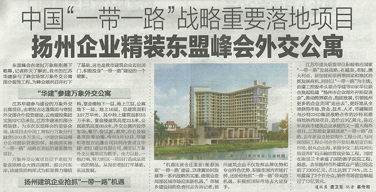 9月12日《揚州晚報》刊載華建東盟峰會外交公寓項目消息 時間:2016-09-12 3841 近日,東盟峰會在老撾萬象剛剛落下帷幕。9月12日,《揚州晚報》A7版刊載題為《中國“一帶一路”戰(zhàn)略重要落地項目 揚州企業(yè)精裝東盟峰會外交公寓》的文章,詳細報道華建積極踐行國家“一帶一路”戰(zhàn)略,承建東盟峰會場館萬象外交公寓精裝修工程的有關(guān)情況。