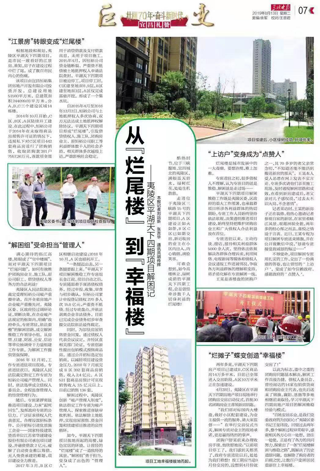 8月13日《三峽晚報(bào)》第7版整版報(bào)道了江蘇華建宜昌分公司總承包建設(shè)的平湖天下四期項(xiàng)目“從爛尾樓”到“幸福樓”的蝶變故事。