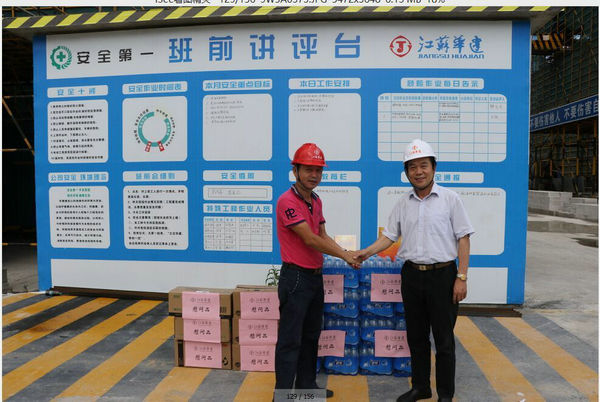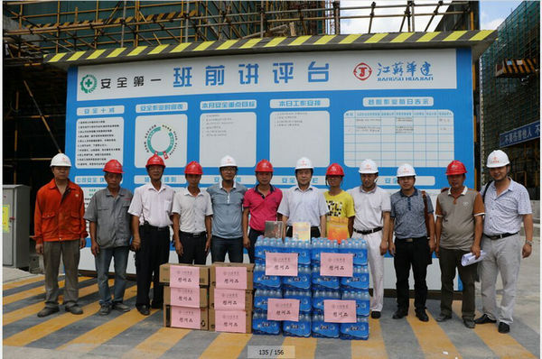 區域公司領導赴三亞工地進行高溫慰問 時間:2015-06-20 3188 6月19日上午,海南分公司黨總支副書記沈巨青帶隊,在分公司工會代表等相關部門陪同下,走訪慰問了三亞婦幼保健院項目部,看望了堅守崗位奮戰在高溫一線的項目部人員,并給他們送去了礦泉水、洗漱用品和防暑藥品。 慰問組一行實地了解項目部的進展情況以及現場人員的食、住、行、業務學習安排等情況,叮囑大家在高溫季節要切實加強現場管理,繃緊安全弦,確保平穩有序生產。