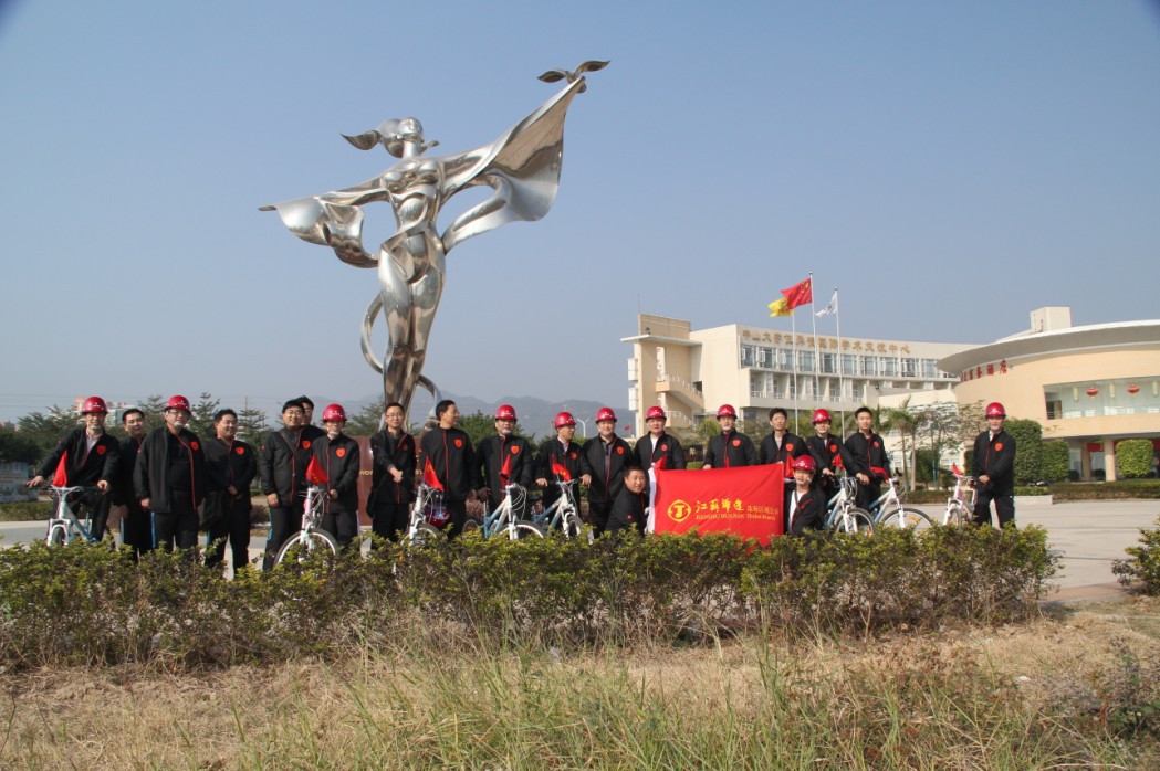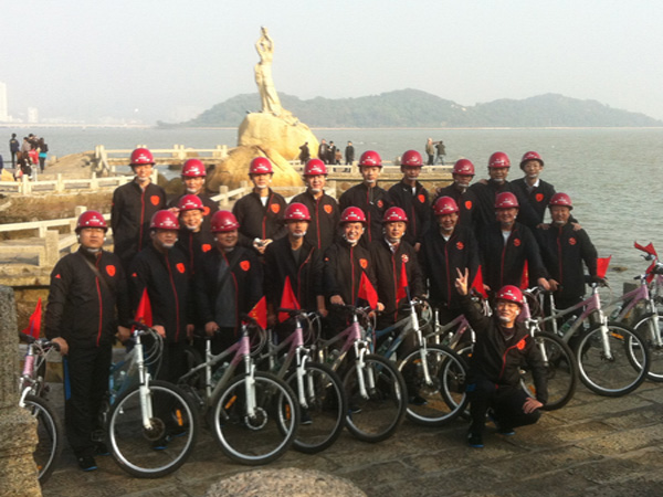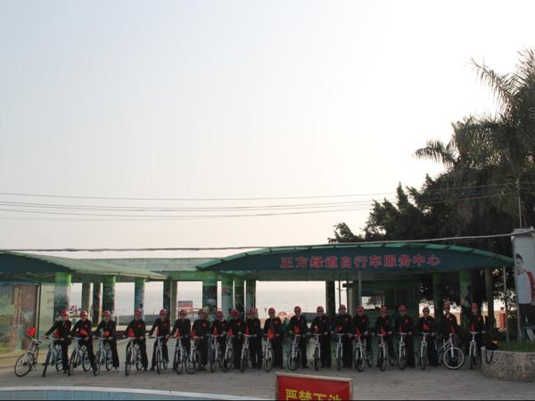 201211上午9時,珠海區域公司全體員工在公司經理室的帶領下,統一著裝,頭戴印有江蘇華建標識的安全頭盔,騎著統一插有江蘇華建小紅旗的自行車,沿著珠海海濱綠道開展騎自行車迎新年活動。騎行的起點是珠海海濱浴場,終點是珠海淇澳島,來回全程56公里。騎行過程中,隊伍有序安全行進,引導車上醒目的江蘇華建大旗迎風招展,每輛自行車前面的江蘇華建小紅旗也分外引人注目。繆國樞總經理身先士卒,騎行在隊伍的最前面,無論是年近6旬的老員工,還是剛工作不久的新員工,個個爭先恐后,奮勇向前,江蘇華建這支特殊的“騎兵隊”在新年的第一天飛行在珠海的海濱綠道上,形成了一道亮麗的風景線,引得許多路人和游客紛紛駐足觀望,許多攝影愛好者也紛紛舉起手中的相機爭相拍照。  這次元旦騎自行車活動既是一次低碳環保生活的宣傳,也是一次江蘇華建員工良好精神風貌的展現,通過這次活動既鍛煉了員工的體魄,更激發了員工們新的一年里奮發向上,團結拼搏,奔向新未來的昂揚斗志。