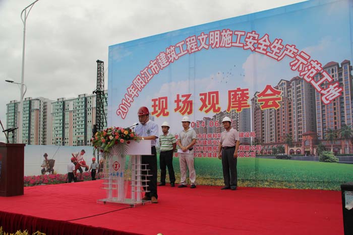 6月17日上午,“2014年陽江市建筑工程文明施工安全生產示范工地現場觀摩會”,在我公司第一項目部施工的陽光馬德里二期工程項目現場舉行。陽江市建設局副局長馮成富、質量安全監督站站長林子歡、書記何聲海和各縣(市、區)住建局安全生產分管負責人、安監站站長以及所有施工、監理單位負責人、安全管理人員近300人參加觀摩會。