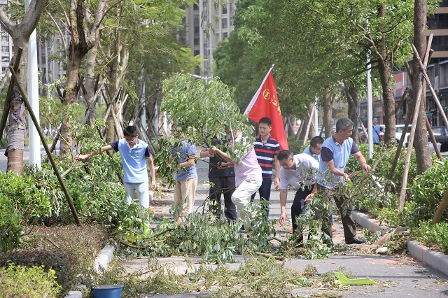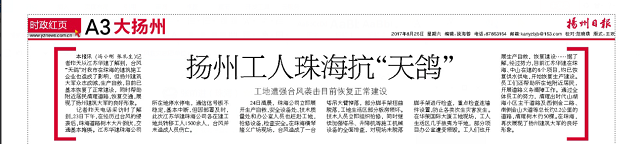 8月23日,珠海遭遇了53年來最強(qiáng)臺風(fēng)“天鴿”,全市受災(zāi)嚴(yán)重。臺風(fēng)過后,珠海公司第一時間迅速組織復(fù)產(chǎn)自救工作,并主動聯(lián)系珠海有關(guān)部門,迅速組織志愿者及重型工程車輛投入到社會道路的清理中去。在這場抗風(fēng)救災(zāi)的戰(zhàn)斗中,珠海公司共疏通社區(qū)道路5條、市政道路3 條,清走倒伏大樹200余棵,運(yùn)送災(zāi)后垃圾 20車次。《揚(yáng)州日報(bào)》A3版顯著位置對公司抗風(fēng)救災(zāi)活動進(jìn)行了報(bào)道,點(diǎn)評江蘇華建珠海公司“眾志成城,生產(chǎn)自救,展現(xiàn)了揚(yáng)州建筑大軍的良好形象”。