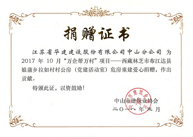 中山分公司在“萬企幫萬村”精準扶貧行動中受表彰 時間:2018-04-18 3155 近日,中山市建筑業協會召開2018年年會暨工程創優表彰大會。會上,協會為去年愛心捐贈支持“萬企幫萬村”扶貧行動——西藏林芝市工布江達縣娘蒲鄉拉如村村公房(黨建活動室)危房重建項目的會員企業頒發了捐贈證書,以表揚捐贈單位的大愛精神,中山分公司受到表彰。