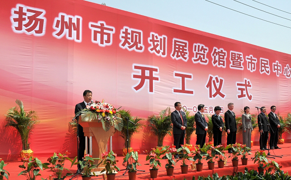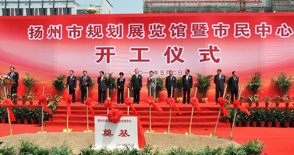 開工儀式由副市長陳揚主持,市政府副秘書長、建設局局長王駿對項目具體情況作了介紹,建工控股董事長陸金龍代表建設代理方作表態(tài)發(fā)言,他提出要抓好三個方面的重點工作,一是舉全系統(tǒng)之力組建項目管理的精英團隊,著力體現(xiàn)揚州建筑大市的實力和水平。二是高起點規(guī)劃,高標準建設,著力打造體現(xiàn)揚州文化底蘊、彰顯現(xiàn)代個性的標志性建筑。三是切實加強組織領導,著力展示建工系統(tǒng)干部職工的精神風貌。市長謝正義代表市委、市政府致辭,他指出這個項目的建設對進一步提升城市基礎設施建設水平,完善城市功能,提升城市品質,建設“創(chuàng)新?lián)P州、精致?lián)P州、幸福揚州”,都具有深遠和重要的意義。他對該項目提四點要求:一要深化方案,用城市客廳的理念,把這座建筑打造成揚州新的建筑標桿、節(jié)能的標桿;二要嚴格管理,確保安全施工和工程質量,爭創(chuàng)“魯班獎”;三要精心組織,確保工程進度,力爭2011年底竣工;四要堅持原則,確保工程廉潔,大家平平安安。希望參與建設的各單位統(tǒng)一思想、明確目標,努力把揚州市規(guī)劃展示館與市民中心建設成優(yōu)質工程、品牌工程、民心工程,為建設精致?lián)P州增添一抹亮麗的風景線。