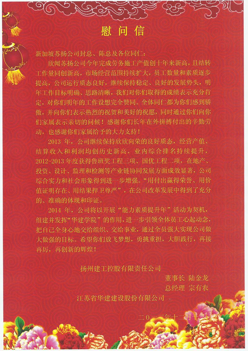 公司董事長、總經理發慰問信鼓勵新加坡蘇揚公司再接再厲 時間:2013-12-13 3489 12月中上旬,公司總部完成了對國內各區域公司的年終走訪調研。新加坡蘇揚公司則通過電子稿匯報了2013年工作情況及下年度工作思路。2013年新加坡蘇揚公司主要經濟指標創歷史新高;隊伍規模保持穩定;班組承包責任制成果顯著;市場份額持續擴大。總部認為這一年來蘇揚公司保質態,擴市場,穩增長,取得了不俗成績,公司董事長陸金龍、總經理宗有農特發慰問信鼓勵蘇揚公司再接再厲,再創新高!慰問信全文如下: