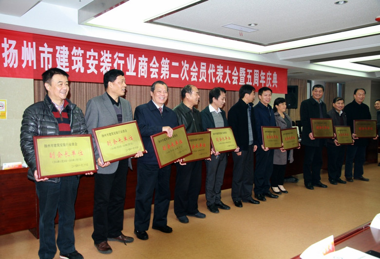 11月28日,揚州市建筑安裝行業商會在高郵市隆重召開第二次會員代表大會暨成立五周年慶典活動,46家會員企業代表參加,揚州市人大副主任、市工商聯主席、總商會會長孫永如,市委統戰部副部長、揚州市工商聯黨組書記、總商會黨委書記趙振東,市工商聯、總商會秘書長劉俊,市民政局社團管理處處長張紹華等出席會議,市房地產商會、建筑業協會等兄弟友好商會會長列席會議。