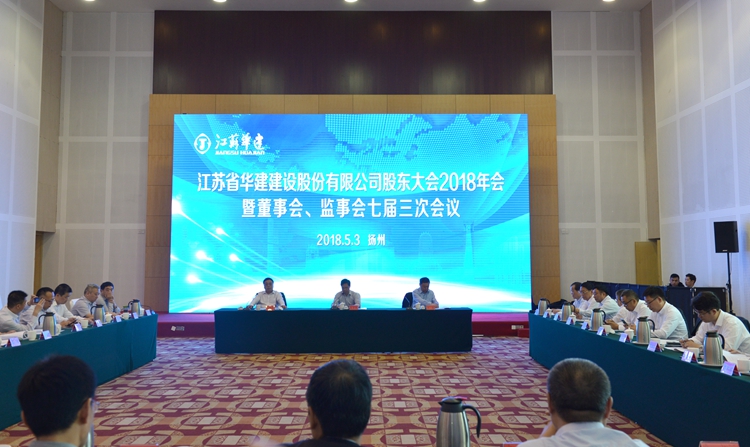 53日下午,江蘇華建股東大會2018年會暨董事會監事會七屆三次會議在揚州召開。公司股東單位代表和董事、監事出席會議,公司高級管理人員、各分支機構和總部各部室負責人、律師團律師列席會議,王宏董事長主持會議,揚州市政府副秘書長林寶榮出席會議并致辭。