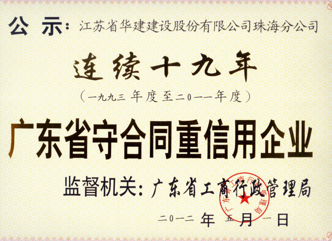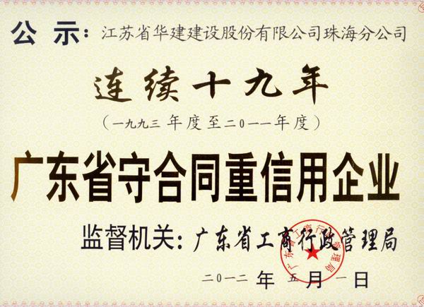 珠海公司連續19年榮獲“廣東省守合同重信用企業”榮譽稱號 時間:2012-06-28 5800 珠海公司連續19年榮獲“廣東省 守合同重信用企業”榮譽稱號 五月份珠海分公司被廣東省工商行政管理局授予“連續十九年廣東省守合同重信用企業”榮譽稱號。
