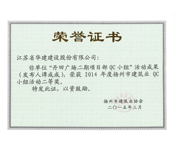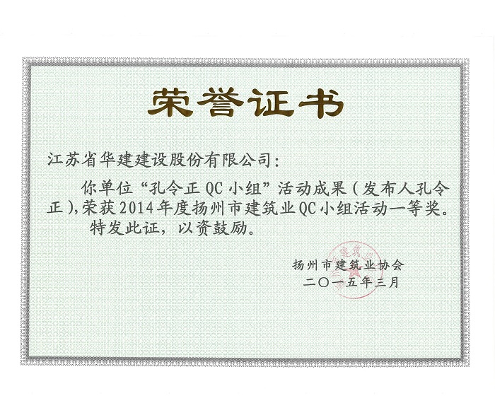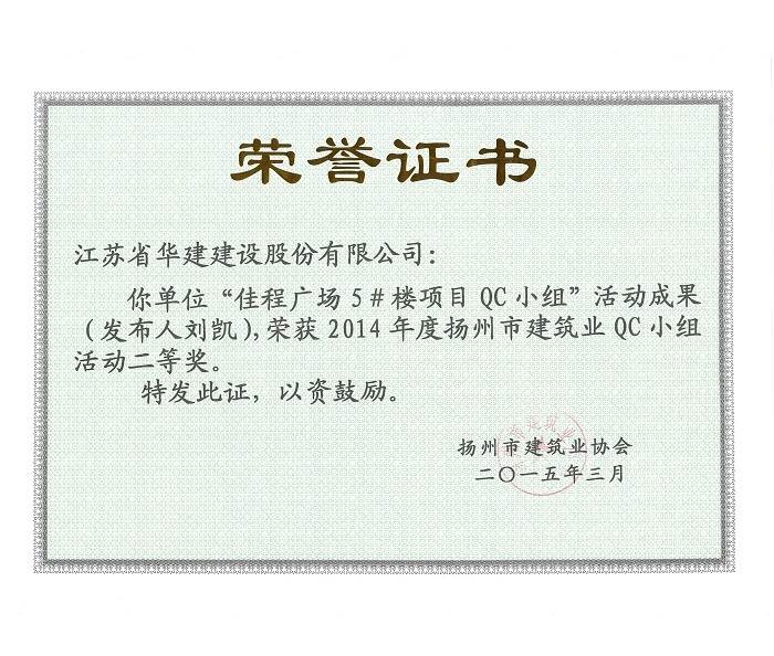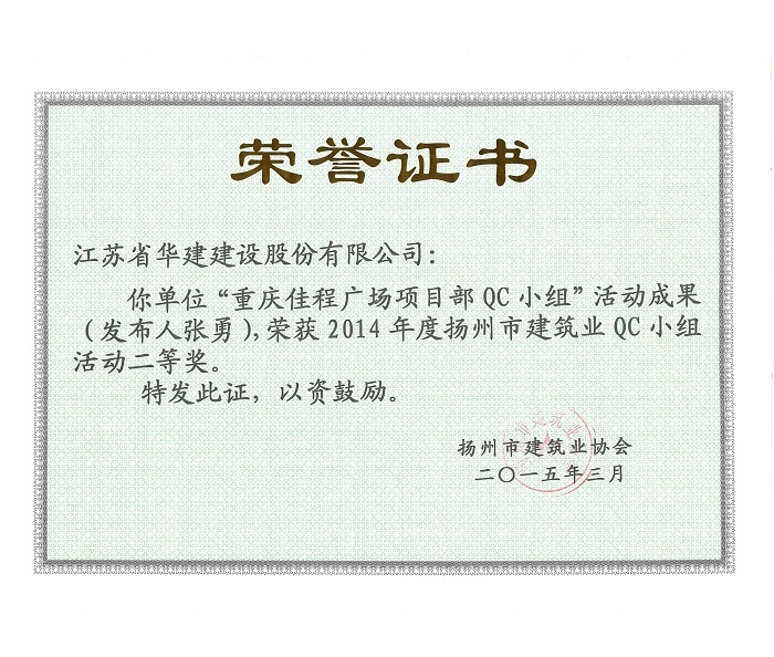 公司5項成果獲揚州市建筑業QC成果獎 時間:2015-03-31 4787 近日,揚州市建筑業協會發文表彰了2015年度全市建筑業QC小組活動成果獎,公司共有5項成果獲獎,其中,“孔令正QC小組”活動成果《剝蝕丘陵地貌多形截面鋼筋混凝土灌注樁施工新方法》榮獲一等獎,“佳程廣場5#樓項目QC小組”活動成果《提高核心筒筒體結構施工質量》、“重慶佳程廣場項目部QC小組”活動成果《提高現澆混凝土樓梯結構施工質量》、“丹田廣場二期項目部QC小組”活動成果《提高蒸壓加氣混凝土砌塊外墻合格率》榮獲二等獎,“馬賽公館項目部QC小組”活動成果《 提高耐磨金剛砂地面施工質量》榮獲三等獎。