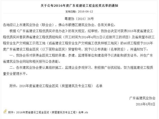 日前,從廣東省建筑業協會傳來喜報,公司承建的陽江市“陽光馬德里花園二期53-55棟”項目榮獲廣東省建筑工程最高獎——金匠獎。“陽光馬德里花園二期53-55棟”項目憑借過硬的工程質量和安全管理水準,在全省眾多的參選項目競爭中脫穎而出。